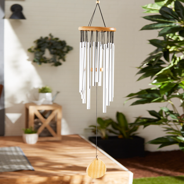 - Hang anywhere, including a patio, garden, front porch, or kitchen window, to fill your home with natural music and gorgeous sculptural design. This wind chime will enhance any space with ambient noise and beautiful art. Dust lightly or wipe with a damp cloth.