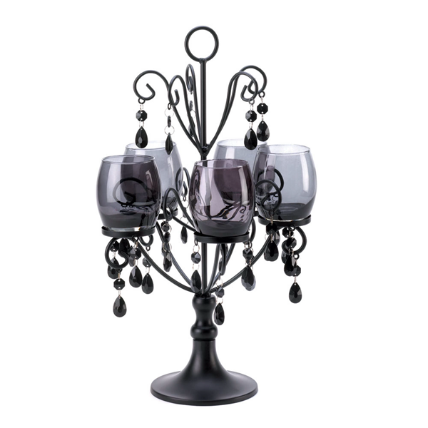 • A perfect centerpiece of a romantic table setting, Midnight Elegance Candelabra combines the dim glow of his five candles behind tinted glass with glamorous faceted baubles.